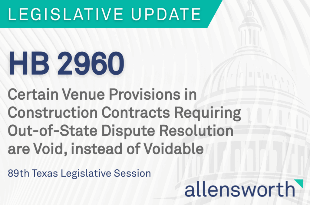 Prior to HB 2960, such provisions were only voidable under Section 272.001, meaning they were still enforceable unless a contractual party affirmatively disputed them. In addition, the bill’s author raised concerns created by a Texas appellate court decision holding that the rights afforded by Section 272.001 are waivable. See In re MVP Terminalling, LLC, No. 14-21-00399-CV, 2022 Tex. App. LEXIS 6182 (Tex. App.—Houston [14th Dist.] Aug. 23, 2022, no pet.). Now, any such provisions are automatically void, regardless of the parties’ intent or actions. This will further ensure that parties to applicable construction contracts are not forced to resolve legal disputes out of state and cut down on contract negotiations over those types of provisions.