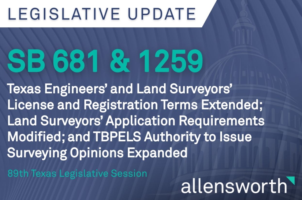 SB 681 & SB 1259 amended: (1) the license and registration terms for Texas engineers and land surveyors; (2) the application requirements for Surveyors-in-Training and Professional Land Surveyors, and (3) the Texas Board of Professional Engineers and Land Surveyors’ (Board) authority to issue reports and opinions related to surveying matters.